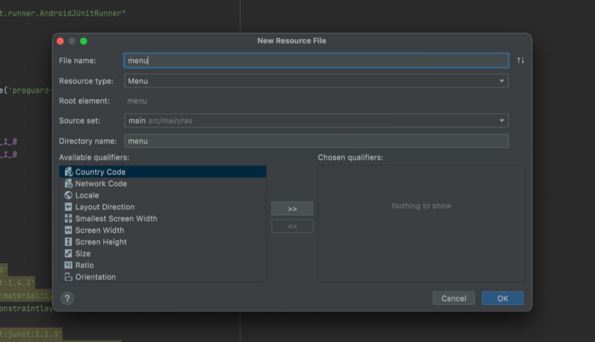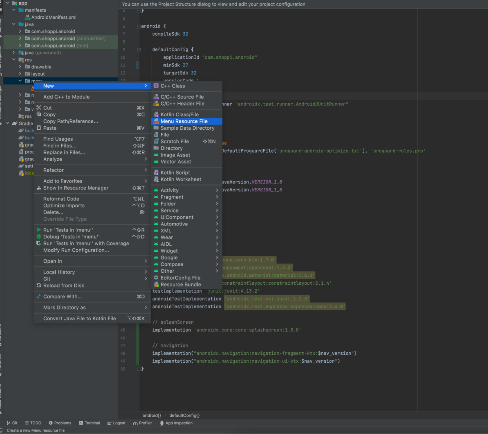 res > New > Android Resource Directory 에서 Menu 폴더 생성