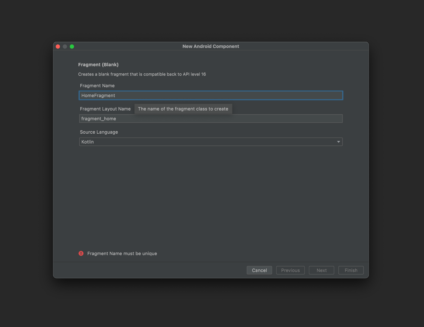 New > Kotlin Class/File에서도 Fragmen 파일을 만들어도 상관없지만 레이아웃 파일은 생성되지 않기 때문에