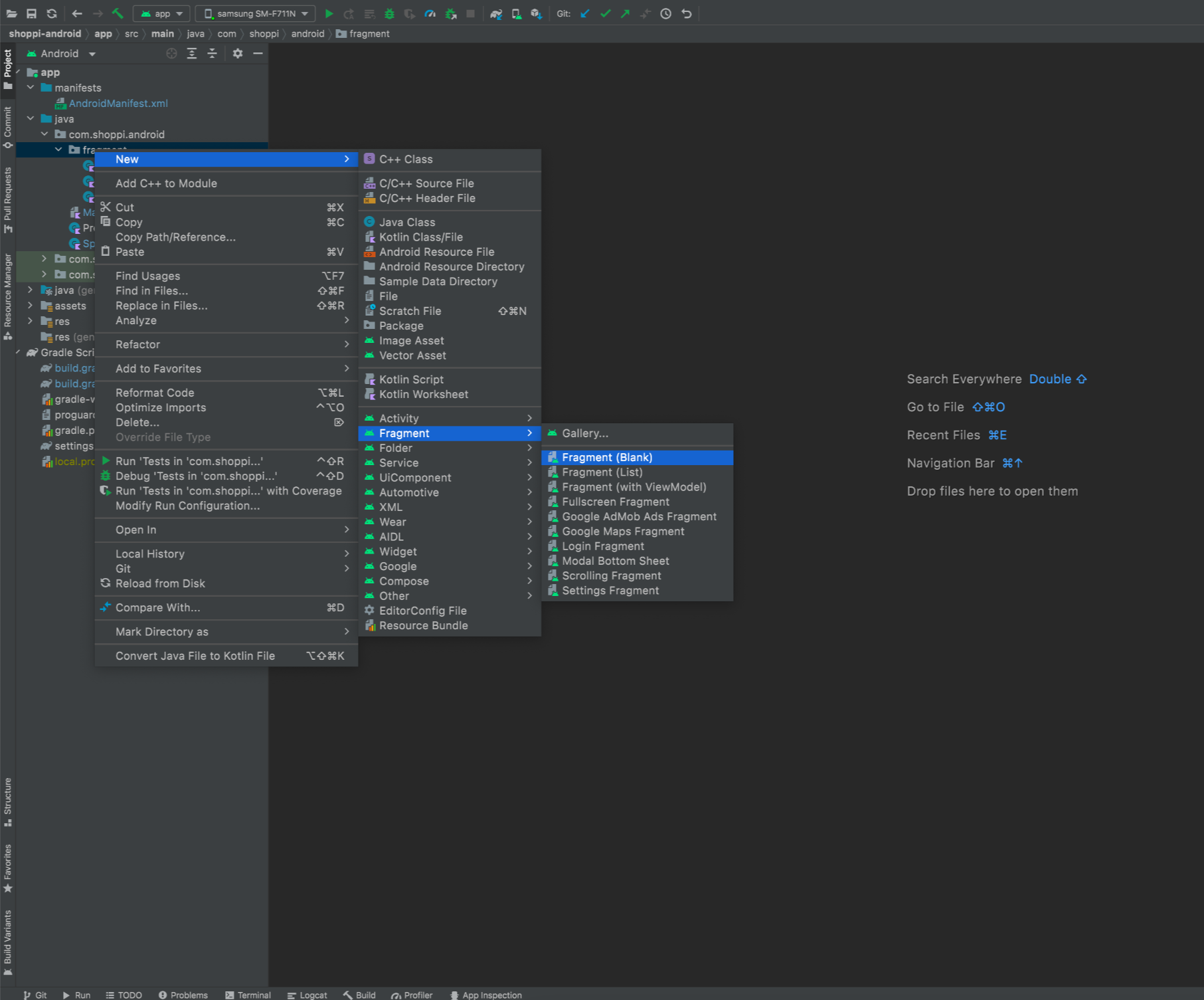 ** package폴더 > New > Fragment > Fragment (Blank)로 Fragment 파일을 만들어주세요.