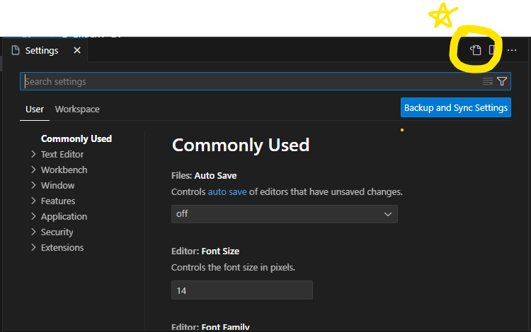 조그마한 아이콘을 클릭하면, settings.json이 열리는데 여기서 sass에 관련한 문법을 셋팅해주도록 한다.
